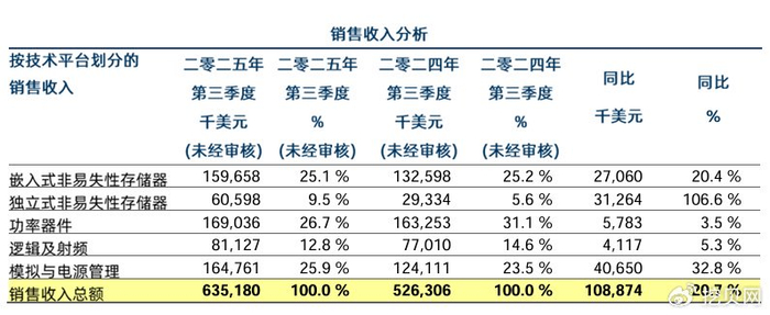 华虹公司表示,本季度(今年第三季度,下同)嵌入式非易失性存储器销售收入 1.597 亿美元,同比增长 20.4%,主要得益于 MCU 产品的需求增加;本季度独立式非易失性存储器销售收入6,060万美元,同比增长106.6%,主要得益于闪存产品的需求增加。