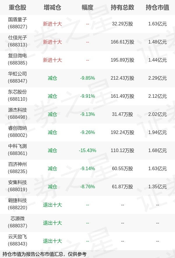 证券之星消息,1月22日博时基金旗下唐屹兵管理的博时上证科创板100交易型开放式指数基金公布年报,近1年净值增长率72.82%。与上一季度相比,该基金前十大重仓股新增国盾量子,仕佳光子,复旦微电;其中华虹公司持仓占比3.4%,为该基金第一大重仓股;翱捷科技,芯源微,云天励飞等退出前十大重仓股;详细数据如下: