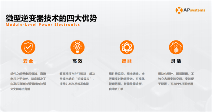 伴随分布式光伏的加速渗透,安全、智能、灵活逐渐成为光伏逆变器重要的衡量标准,以微型逆变器为代表的MLPE的技术优势也日益凸显。对此,周总综合对比组串式逆变器、微型逆变器、关断器和优化器的技术特点,指出:微型逆变器技术路线具有安全、高效、智能、灵活四大优势。