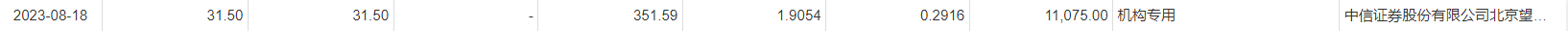 今日大宗交易成交351.59万股,成交额1.11亿元,占当日总成交额的74.37%,成交价31.5元,较市场收盘价持平。