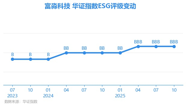 日前,华证指数公布了新一期(2025年10月31日)的ESG评级结果,富淼科技(688350.SH)获得BBB评级(华证指数评级为C起至AAA九档,C为最低档,AAA为其最高一级评级/AA为其第二档),上一期(2025年7月31日)ESG评级为BBB。本期ESG评级在494家化学制品行业A股上市公司中排名第92(上一期排名第90)。