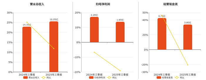 公司营业总收入为16.05亿元,在已披露的同业公司中排名第42,较去年同报告期营业总收入增加1.69亿元,实现4年连续上涨,同比较去年同期上涨11.80%。归母净利润为1.85亿元,在已披露的同业公司中排名第43,较去年同报告期归母净利润减少4386.11万元,同比较去年同期下降19.20%。经营活动现金净流入为3.80亿元,在已披露的同业公司中排名第27,较去年同报告期经营活动现金净流入减少9836.13万元,同比较去年同期下降20.55%。