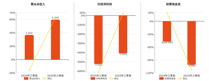 公司营业总收入为5.39亿元。归母净利润为-1.03亿元。经营活动现金净流入为-1.96亿元,较去年同报告期经营活动现金净流入减少1.04亿元。