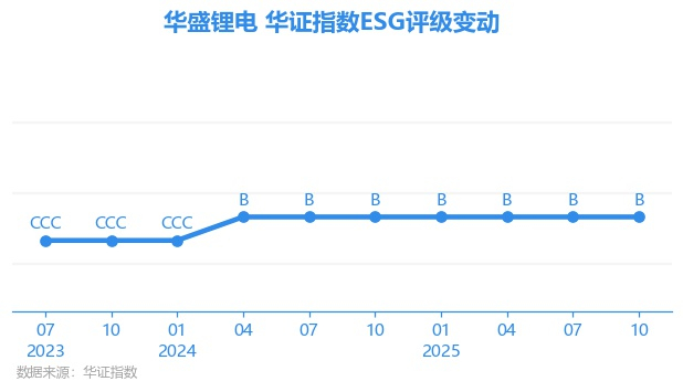 日前,华证指数公布了新一期(2025年10月31日)的ESG评级结果,华盛锂电(688353.SH)获得B评级(华证指数评级为C起至AAA九档,C为最低档,AAA为其最高一级评级/AA为其第二档),上一期(2025年7月31日)ESG评级为B。本期ESG评级在494家化学制品行业A股上市公司中排名第194(上一期排名第234)。