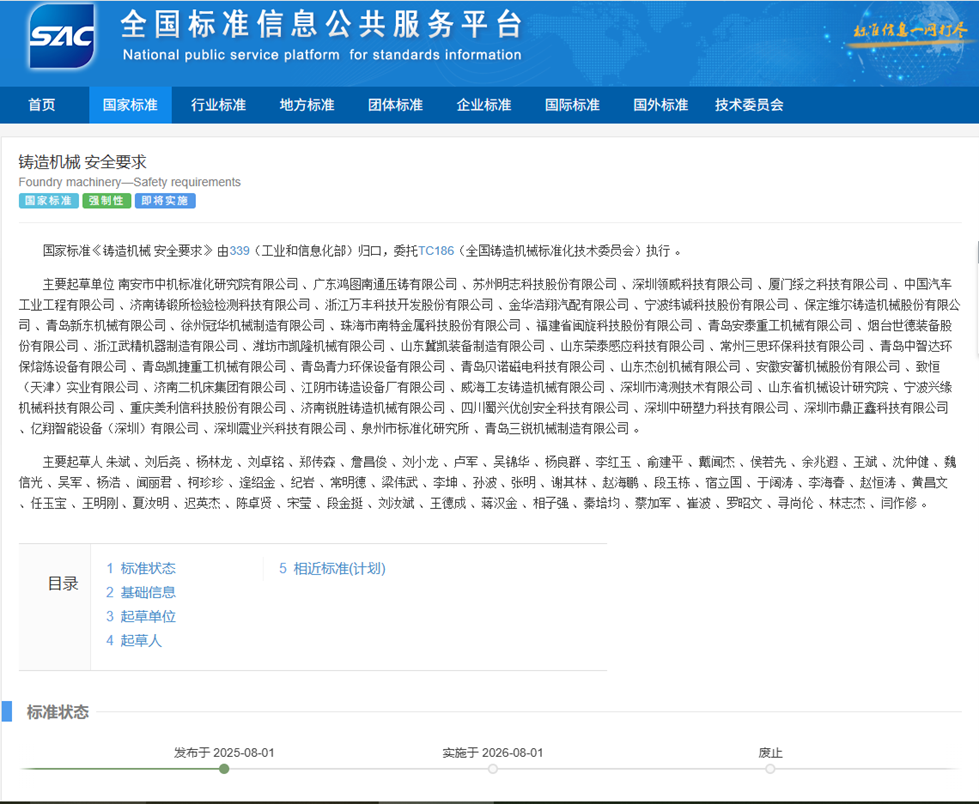 根据全国标准信息公共服务平台信息公示,明志科技参与制定的《GB 20905-2025 铸造机械 安全要求》,于2025年8月1日正式获批发布,并将于2026年8月1日正式实施。