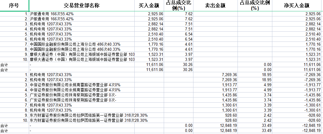 具体来看,机构买入5392.54万元,卖出8569.96万元,合计净卖出3177.42万元。此外,沪股通专用、中国国际金融上海分公司分别买入2925.06万元、1770.16万元;中信证券余姚南雷路证券营业部、广发证券珠海紫荆路证券营业部分别卖出1913.77万元、1435.86万元。