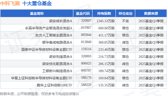 持有中科飞测最多的基金为诺安成长混合A,目前规模为184.68亿元,最新净值1.897(10月31日),较上一交易日下跌2.92%,近一年上涨41.04%。该基金现任基金经理为刘慧影。