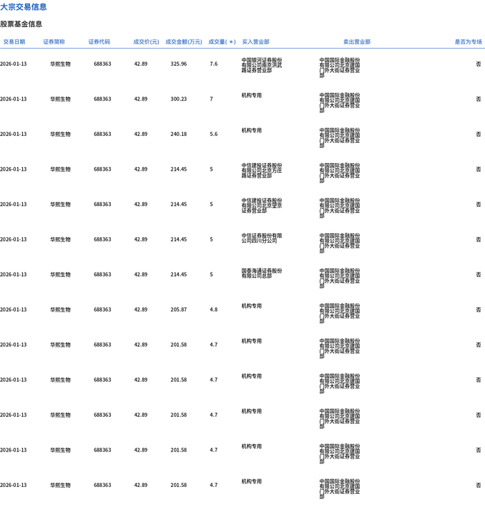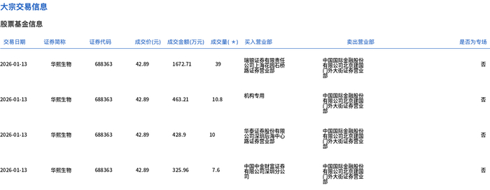1月13日,华熙生物大宗交易成交135.9万股,成交额5828.72万元,占当日总成交额的9.64%,成交价42.89元,较市场收盘价47.34元折价9.4%。