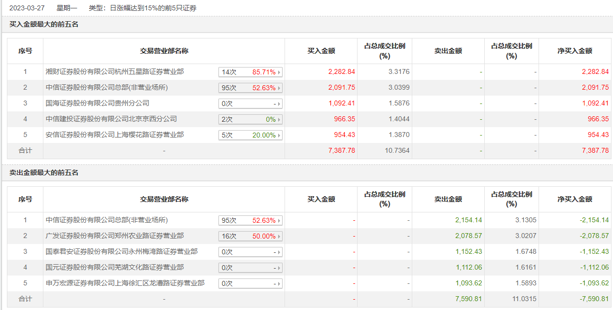 具体来看,湘财证券杭州五星路证券营业部、中信证券总部(非营业场所)分别买入2282.84万元、2091.75万元;中信证券总部(非营业场所)、广发证券郑州农业路证券营业部分别卖出2154.14万元、2078.57万元。