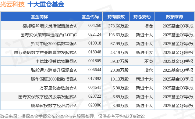 根据2025基金Q3季报公募基金重仓股数据,重仓该股的公募基金共13家,其中持有数量最多的公募基金为德邦基金的德邦稳盈增长灵活配置混合A。德邦稳盈增长灵活配置混合A目前规模为0.44亿元,最新净值0.9377(11月19日),较上一交易日下跌1.0%,近一年上涨15.77%。该公募基金现任基金经理为雷涛 陆阳。雷涛在任的基金产品包括:德邦半导体产业混合发起式A,管理时间为2021年12月28日至今,期间收益率为90.29%;德邦福鑫灵活配置混合A,管理时间为2023年10月13日至今,期间收益率为0.99%;德邦科技创新一年定开混合A,管理时间为2023年10月13日至今,期间收益率为17.28%。陆阳在任的基金产品包括:德邦鑫星价值灵活配置混合A,管理时间为2024年1月30日至今,期间收益率为224.02%;德邦高端装备混合发起式A,管理时间为2025年3月14日至今,期间收益率为-0.02%。