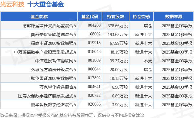根据2025基金Q3季报公募基金重仓股数据,重仓该股的公募基金共13家,其中持有数量最多的公募基金为德邦基金的德邦稳盈增长灵活配置混合A。德邦稳盈增长灵活配置混合A目前规模为0.44亿元,最新净值0.9534(12月30日),较上一交易日上涨0.73%,近一年下跌0.67%。该公募基金现任基金经理为雷涛 陆阳。雷涛在任的基金产品包括:德邦半导体产业混合发起式A,管理时间为2021年12月28日至今,期间收益率为96.05%;德邦福鑫灵活配置混合A,管理时间为2023年10月13日至今,期间收益率为11.78%;德邦科技创新一年定开混合A,管理时间为2023年10月13日至今,期间收益率为26.83%。陆阳在任的基金产品包括:德邦鑫星价值灵活配置混合A,管理时间为2024年1月30日至今,期间收益率为297.34%;德邦高端装备混合发起式A,管理时间为2025年3月14日至今,期间收益率为15.05%。