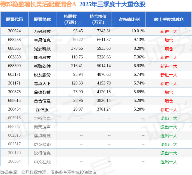 德邦稳盈增长灵活配置混合A的前十大重仓股如下:
