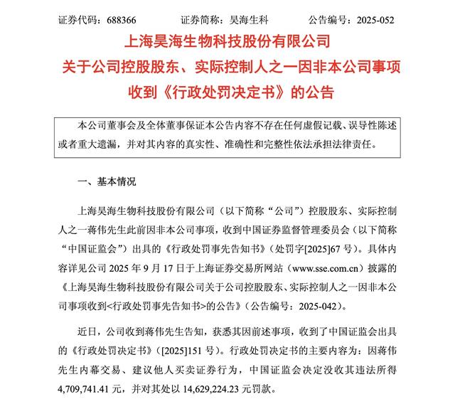 回溯此案时间线,2025年5月7日,昊海生科披露公告称,实控人蒋伟因涉嫌内幕交易被证监会立案调查;9月16日,公司收到蒋伟转发的《行政处罚事先告知书》;12月23日,正式处罚决定落地。整个监管流程历时七个月,效率之高折射出当前资本市场'零容忍'的执法态势。