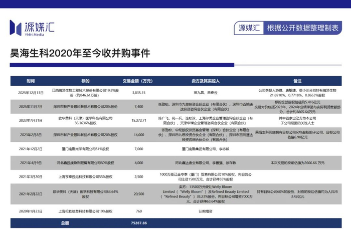 其中,2020年1月增资上海伦胜信息;2021年买入欧华美科63.64%股权、上海亨泰视觉55%股权、河北鑫视康60%股权;2023年买入深圳市新产业20%股权、欧华美科剩余36.36%股权;2025年再度买入深圳市新产业20%股权、江西瑞济生物19.8%股权,5年时间完成9笔收并购事项,合计交易金额约7.53亿元。