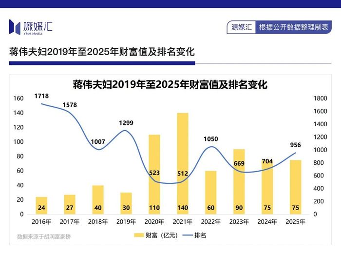 蒋伟夫妇靠着“买买买”快速完成起家,且发展成了与爱美客、华熙生物齐名的“医美三剑客”。同时,蒋伟夫妇财富也水涨船高,于2021年达到巅峰的140亿元,排在第512位,2025年则为75亿元、位于第956位。