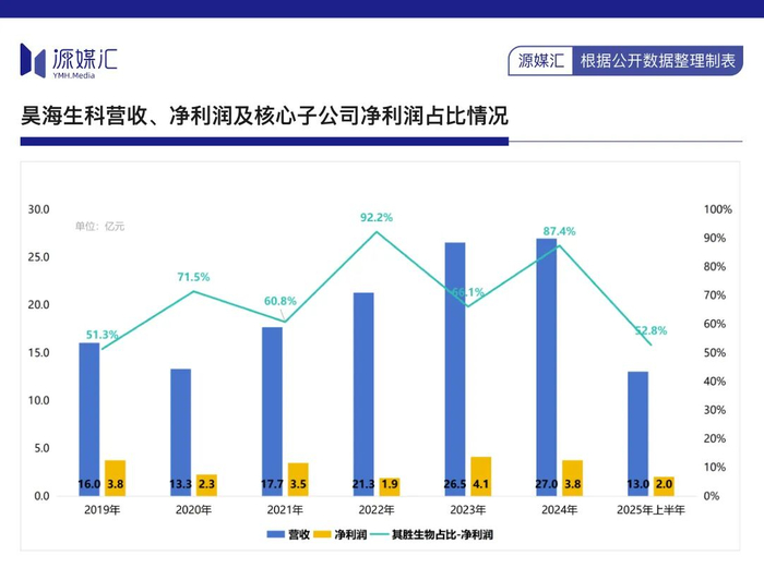 也是在2019年之后,昊海生科的净利润开始快速下跌。其中,很重要的一点是,2019年至2025年上半年,子公司其胜生物占昊海生科的收入区间值为31%-37.3%,但净利润贡献占比为51.3%-92.2%。
