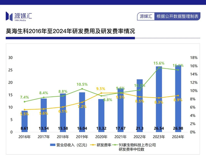 2016年至2024年,昊海生科的研发费用率整体呈现走高趋势,区间值为5.46%-9.51%,其中2024年为8.86%。Wind数据显示,2016年至2024年,93家A股生物科技上市公司的研发费用中位数区间值为7.4%-15.6%。