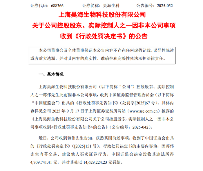 昊海生科近日公告称,蒋伟因内幕交易、建议他人买卖证券行为,被证监会没收违法所得约470.97万元,并处以约1462.92万元罚款。