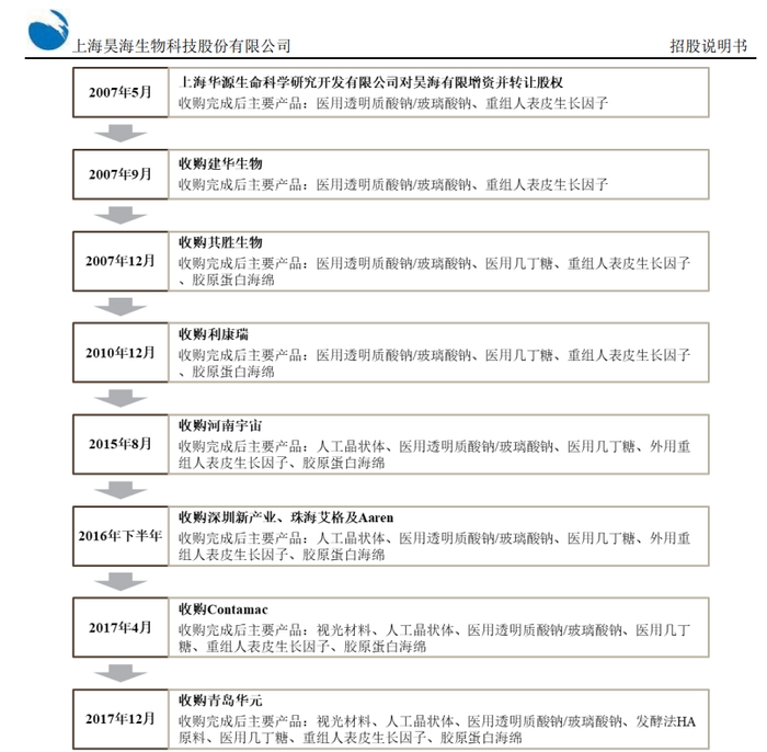 2007年5月,昊海生科引入华源集团旗下子公司上海华源生命科学研究开发有限公司(现名:上海润巍投资管理有限公司),开始向玻尿酸业务延展。华源集团进场仅3个月,因被华润集团重组,遂退出持有昊海生科。