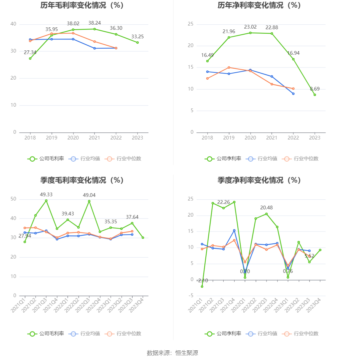 2023年,公司毛利率为33.25%,同比下降3.05个百分点;净利率为8.69%,较上年同期下降8.25个百分点。从单季度指标来看,2023年第四季度公司毛利率为30.15%,同比下降3.05个百分点,环比下降7.49个百分点;净利率为9.27%,较上年同期下降7.14个百分点,较上一季度上升3.75个百分点。