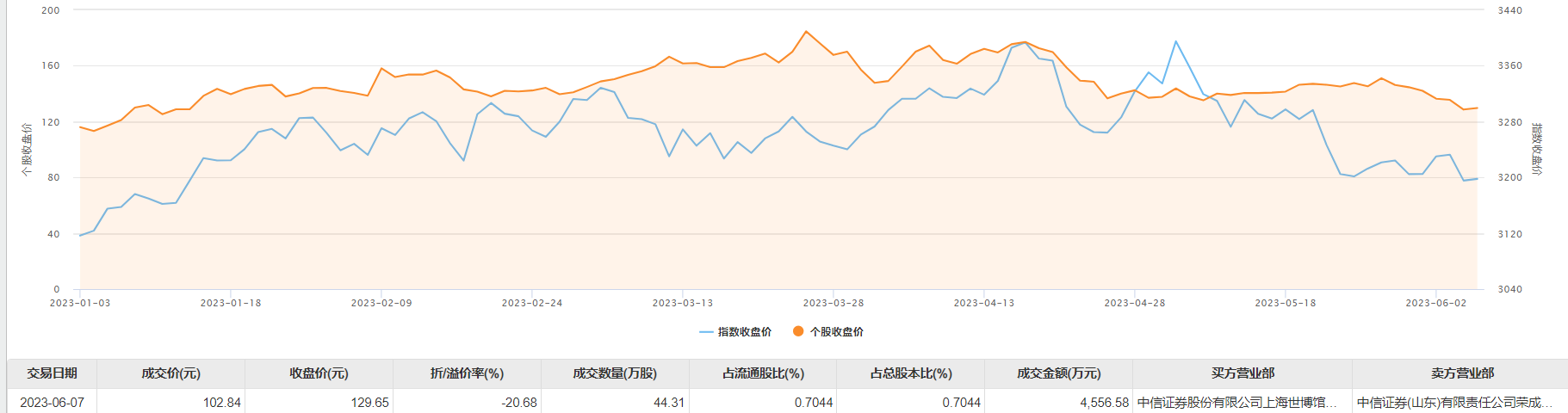 6月7日大宗交易成交44.31万股,成交额4556.58万元,占当日总成交额的35.85%,成交价102.83元,较市场收盘价129.65元折价20.69%。