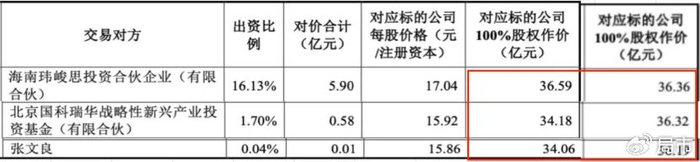 其中,对外部股东国科瑞华和张文良的交易估值进行了上调,分别从34.18亿元、34.06亿元提升至36.32亿元、36.19亿元;而易冲科技管理层持股平台玮峻思的交易估值则从原本的36.59亿元下调至36.36亿元。