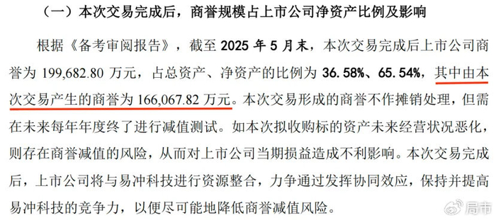 根据披露,截至2025年5月末,上市公司商誉的账面价值为3.36亿元,本次交易将新增商誉16.61亿元,交易完成后上市公司商誉为19.97亿元,占总资产、净资产的比例为36.58%、65.54%。
