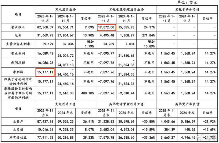 从业绩承诺口径,2025年1-11月,易冲科技充电芯片业务板块实现净利润1.52亿元,其他电源管理芯片业务实现收入1.91亿元,已提前达成2025年度业绩承诺目标。