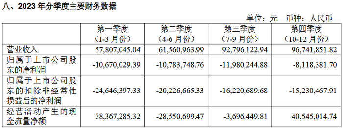 上市次年,菲沃泰四个季度均亏。2023年1-3月,公司归属于上市公司股东的净利润为-1,067.00万元,归属于上市公司股东的扣除非经常性损益的净利润为-2,464.64万元;2023年4-6月,公司归属于上市公司股东的净利润为-1,078.37万元,归属于上市公司股东的扣除非经常性损益的净利润为-2,022.67万元;2023年7-9月,公司归属于上市公司股东的净利润为-1,198.02万元;归属于上市公司股东的扣除非经常性损益的净利润为-1,622.07万元;2023年10-12月,公司归属于上市公司股东的净利润为-8,118.38万元;归属于上市公司股东的扣除非经常性损益的净利润为-1,523.05万元。