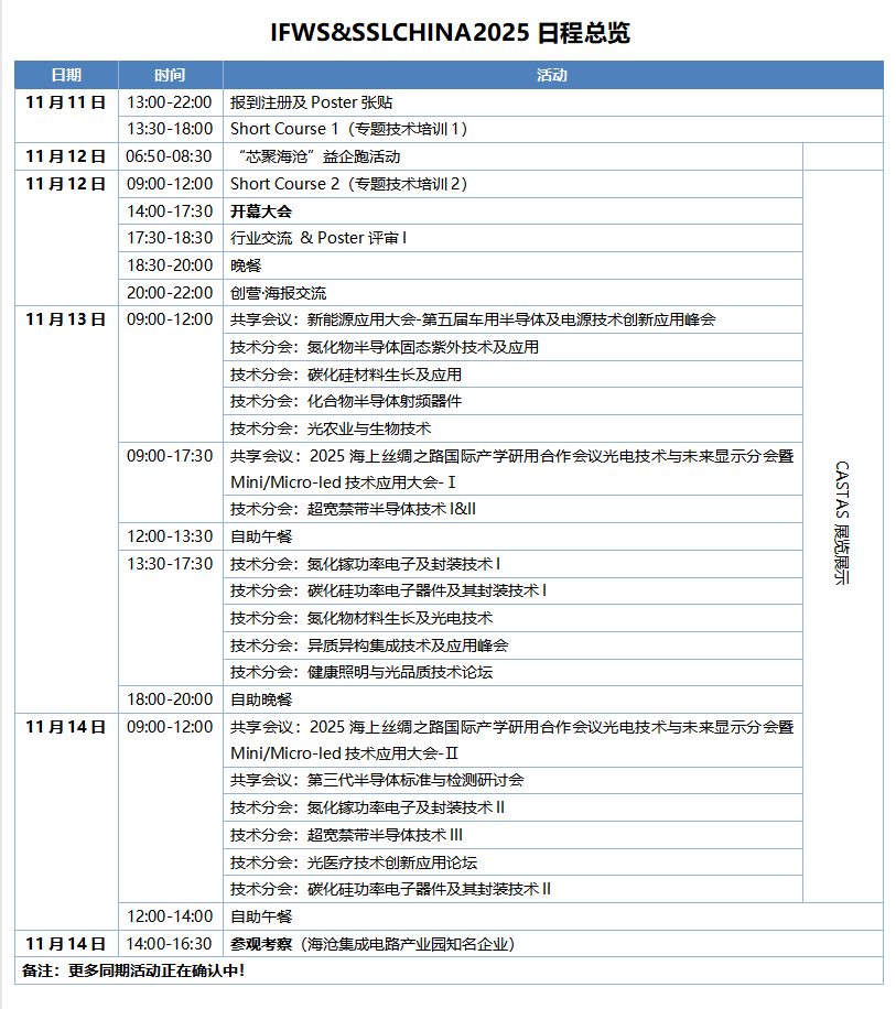 重要活动:2025年11月11-14日,第十一届国际第三代半导体论坛&第二十二届中国国际半导体照明论坛(IFWS&SSLCHINA 2025)将在厦门召开。在全球半导体产业格局深刻大变革的背景下,今年IFWS&SSLCHINA2025论坛全新升级,学术与产业并重,着力链通全球第三代半导体智慧资源,紧跟时代产业发展最新脉动。除了来自产业链不同环节的百余位程序委员专家坐镇,邀请到10多个国家和地区顶级科研院所专家学者、企业代表200余人参与分享主题报告,数十场技术与产业峰会追踪解析全球半导体竞争格局及技术热点,围绕“材料—设备—设计—制造—封测—应用”全链条技术迭代,绘就AI驱动下全球第三代半导体产业重构的新图景。除了重量级报告、技术&产业峰会,论坛同期设有2025先进半导体技术应用创新展(CASTAS2025) 、Short course、芯友荟、City walk、重要签约&发布、创营·POSTER交流&评选(收到210余篇学术论文投稿&现场展示交流)、考察海沧集成电路产业园知名企业、“芯聚海沧”益企跑活动等丰富多彩的系列活动。同时,还将发布"2025年度中国第三代半导体技术十大进展"结果等,令人期待。