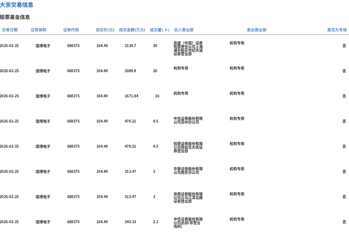 2月25日,国博电子大宗交易成交83.3万股,成交额8704.03万元,占当日总成交额的8.87%,成交价104.49元,较市场收盘价118.07元折价11.5%。