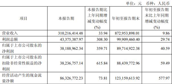年初至报告期末,公司实现营业收入8.73亿元,同比增长9.86%;归属于上市公司股东的净利润8971.49万元,同比增长40.59%;扣除非经常性损益后的净利润8843.98万元,同比增长59.49%,经营活动产生的现金流量净额1.23亿元,同比增长577.97%。