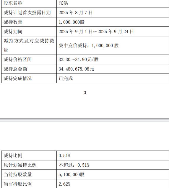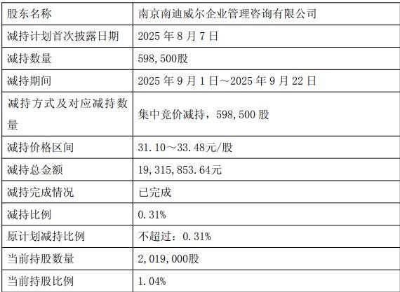 南迪咨询于2025年9月1日至9月22日通过集中竞价交易方式减持公司598,500股人民币普通股股份,占公司总股本的0.31%;张洪于2025年9月1日至9月24日通过集中竞价交易方式(含盘后固定价格交易)减持公司1,000,000股人民币普通股股份,占公司总股本的0.51%。经计算,本次减持共计套现5379.65万元。
