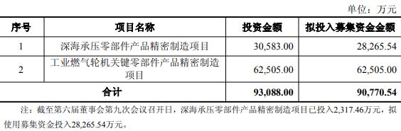 本次发行可转换公司债券的募集资金总额不超过人民币90,770.54万元(含本数),扣除发行费用后,拟用于深海承压零部件产品精密制造项目、工业燃气轮机关键零部件产品精密制造项目。