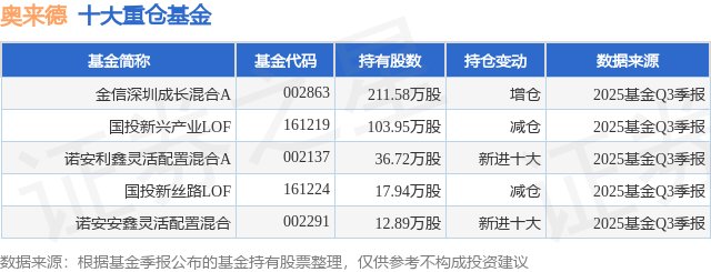 根据2025基金Q3季报公募基金重仓股数据,重仓该股的公募基金共5家,其中持有数量最多的公募基金为金信基金的金信深圳成长混合A。金信深圳成长混合A目前规模为2.67亿元,最新净值2.8448(11月4日),较上一交易日下跌1.33%,近一年上涨51.17%。该公募基金现任基金经理为黄飙 杨超。黄飙在任的基金产品包括:金信优质成长混合A,管理时间为2023年4月12日至今,期间收益率为62.5%;金信周期价值混合A,管理时间为2025年2月20日至今,期间收益率为38.02%;金信转型创新成长混合发起式A,管理时间为2025年5月17日至今,期间收益率为30.57%。杨超在任的基金产品包括:金信转型创新成长混合发起式A,管理时间为2022年1月19日至今,期间收益率为77.07%;金信消费升级股票A,管理时间为2022年8月16日至今,期间收益率为-4.04%;金信景气优选混合A,管理时间为2023年11月2日至今,期间收益率为26.57%;金信智能中国2025混合A,管理时间为2025年4月3日至今,期间收益率为11.32%。