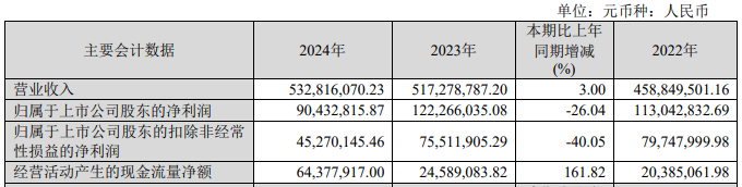 2024年,奥来德营业收入为5.33亿元,同比增长3.00%;归属于上市公司股东的净利润9043.28万元,同比下降26.04%;归属于上市公司股东的扣除非经常性损益的净利润4527.01万元,同比下降40.05%;经营活动产生的现金流量净额为6437.79万元,同比增长161.82%。