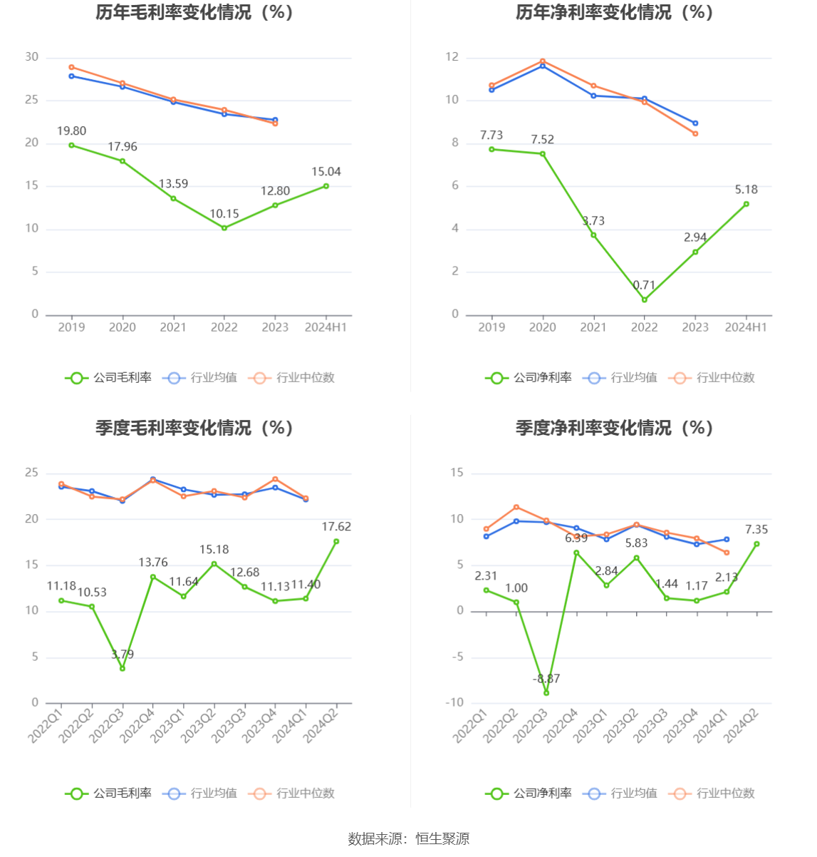 2024年上半年,公司毛利率为15.04%,同比上升1.31个百分点;净利率为5.18%,较上年同期上升0.58个百分点。从单季度指标来看,2024年第二季度公司毛利率为17.62%,同比上升2.44个百分点,环比上升6.22个百分点;净利率为7.35%,较上年同期上升1.52个百分点,较上一季度上升5.22个百分点。