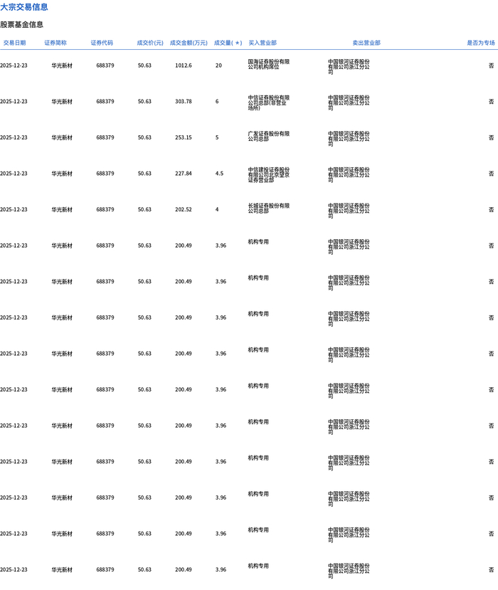 12月23日,华光新材大宗交易成交79.1万股,成交额4004.79万元,占当日总成交额的6.6%,成交价50.63元,较市场收盘价61元折价17%。
