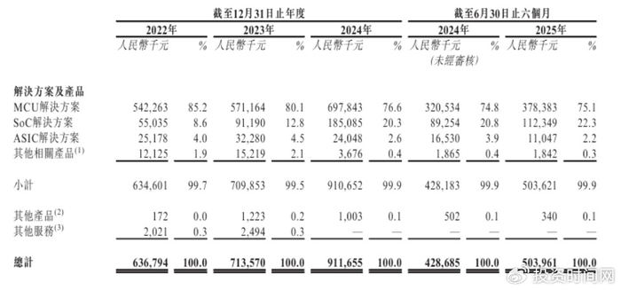 就收入结构而言,MCU解决方案仍是中微半导的主要收入来源,报告期内收入分别为5.42亿元、5.71亿元、6.98亿元及3.78亿元,占比虽从85%以上逐步下降,但仍维持在75%以上。与此同时,SoC解决方案正成为新的增长引擎,收入从5503.5万元增至1.12亿元,占比由8.6%提升至22.3%。