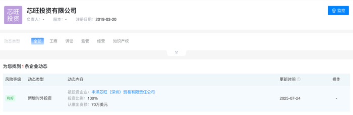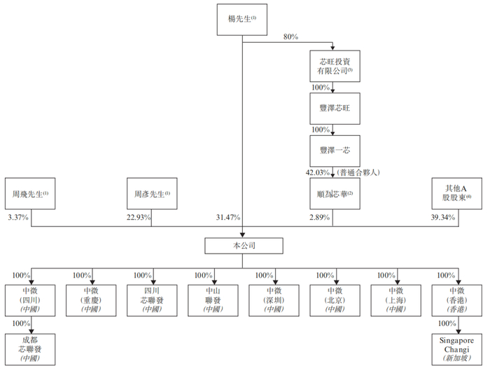 丰泽一芯则由丰泽芯旺全资拥有,丰泽芯旺又由芯旺投资有限公司全资拥有。芯旺投资有限公司成立于2019年3月,总部位于香港,主要从事股权投资业务,由杨勇、苗小雨、柳泽宇分别拥有80%、10%、10%的权益,法人为周彦。