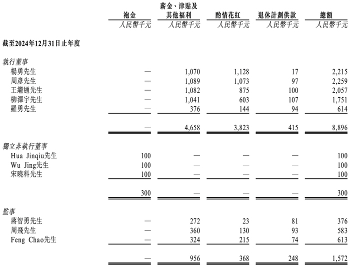 2024年,其董事及监事薪酬如下: