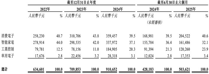 2025年上半年,消费电子、智能家电、工业控制、车用电子应用场景分别贡献了中微半导体收入的40.6%、32.1%、23.9%、3.4%。