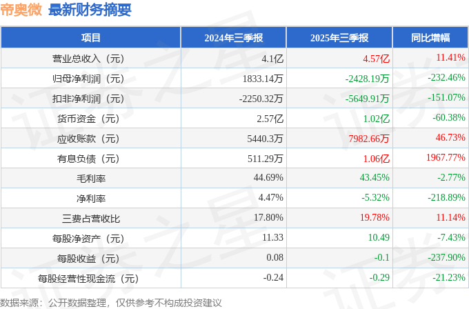 据证券之星公开数据整理,近期帝奥微(688381)发布2025年三季报。根据财报显示,帝奥微增收不增利。截至本报告期末,公司营业总收入4.57亿元,同比上升11.41%,归母净利润-2428.19万元,同比下降232.46%。按单季度数据看,第三季度营业总收入1.51亿元,同比上升4.58%,第三季度归母净利润-2007.27万元,同比下降137.99%。