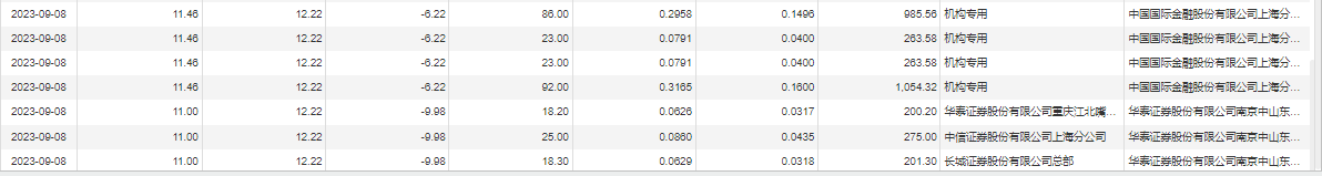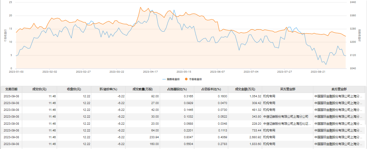 收跌2.94%,收盘价为12.22元,发生15笔大宗交易,合计成交量954.44万股,成交金额1.09亿元。