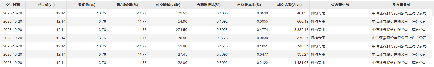 收跌2.69%,收盘价为13.76元,发生7笔大宗交易,合计成交量610万股,成交金额7405.4万元。