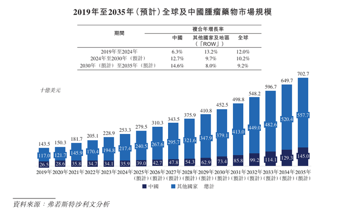 全球肿瘤药物市场规模已从2019年的1,435亿美元增长至2024年的2,533亿美元,复合年增长率为12.0%;预计到2035年将达到7,027亿美元,2024年至2030年以及2030 年至2035年期间的复合年增长率分别为10.2%及9.2%。