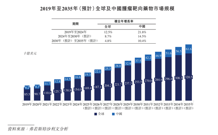中国靶向肿瘤药物市场规模已从2019年的62亿美元增长至2024年的166亿美元,复合年增长率为21.8%;预计到2035年将达到616亿美元,2030年至2035年期间的复合年增长率为10.4%。