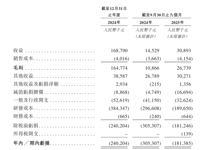 于2024年及截至2025年9月30日止九个月,公司录得年内/期内亏损分别约为2.4亿元、1.81亿元。