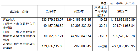 2021年至2024年,公司营业收入分别为11.97亿元、11.84亿元、10.40亿元、9.34亿元,归属于上市公司股东的净利润分别为2.32亿元、2.05亿元、6,030.38万元、4,045.80万元,归属于上市公司股东的扣除非经常性损益的净利润分别为2.20亿元、1.86亿元、4,796.08万元、3,068.27万元,经营活动产生的现金流量净额为-9,606.75万元、-2.73亿元、-96.00万元、1.39亿元。