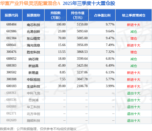 华富产业升级灵活配置混合A的前十大重仓股如下:
